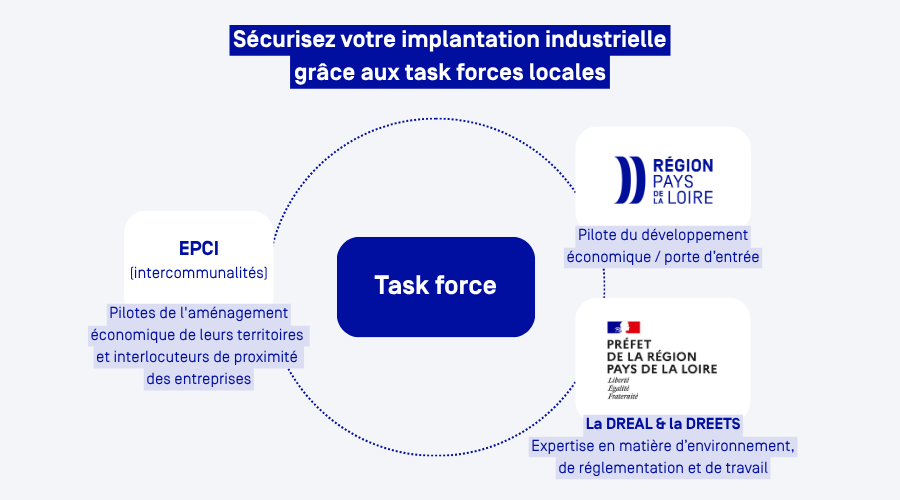Une Task force locale est une instance partenariale créée pour sécuriser et accélérer les projets d’implantation industrielle en Pays de la Loire. Sa force ? Rassembler les acteurs publics et économiques pertinents pour votre projet, afin de vous faire gagner un temps précieux, réduire les risques et offrir une garantie de réussite.